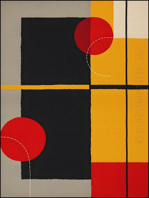 Bauhaus und De Stijl stehen für Reduzierung auf wesentliche geometrische Formen und Farben. Kombiniert mit expressionistischen Portraits entsteht visuelle Zeitgeschichte für den Boden.