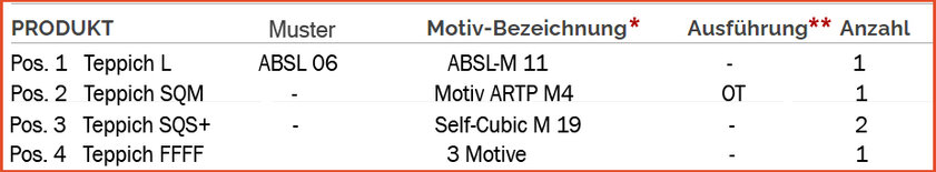 Wählen Sie das Produkt mit Größe, das Basis-Muster, ein Wunschmotiv und Details zur Ausführung.