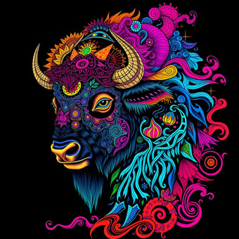 Inspiriert von der psychedelischen Kunst der 60er Jahre. Wilde visuelle Welten und ein breites Farbspektrum treffen auf expressive Tiermotive – „Psychedelic Africa“ im Schwarzlicht-Stil.
