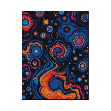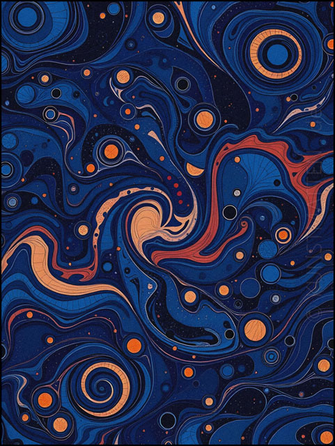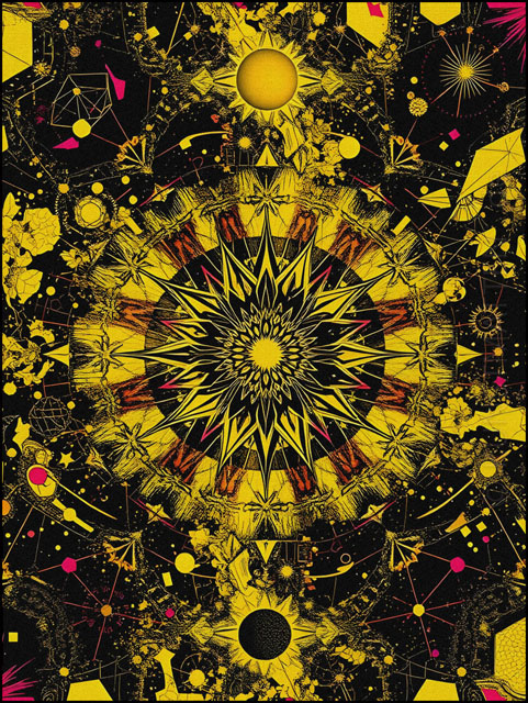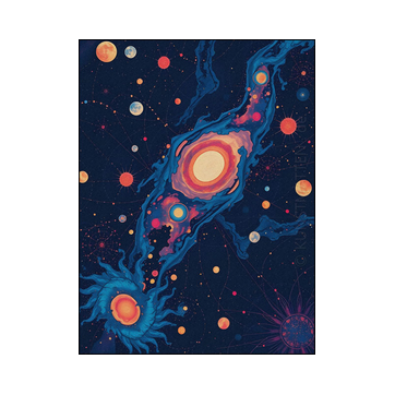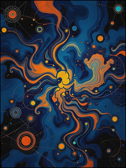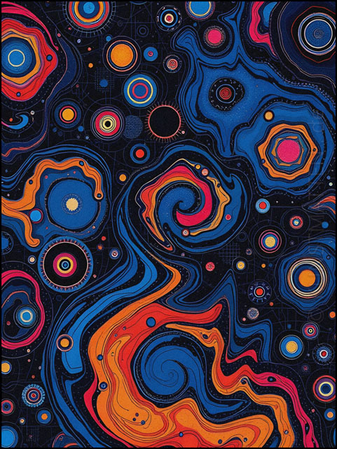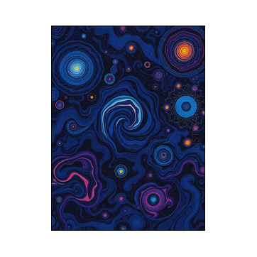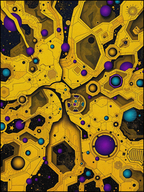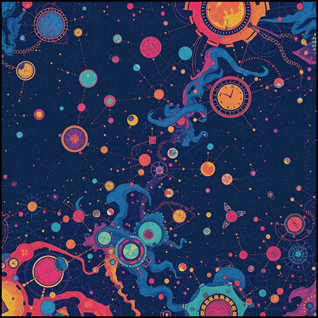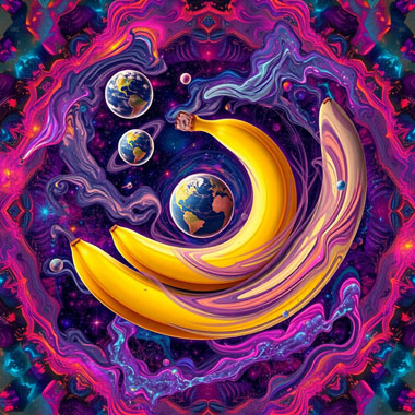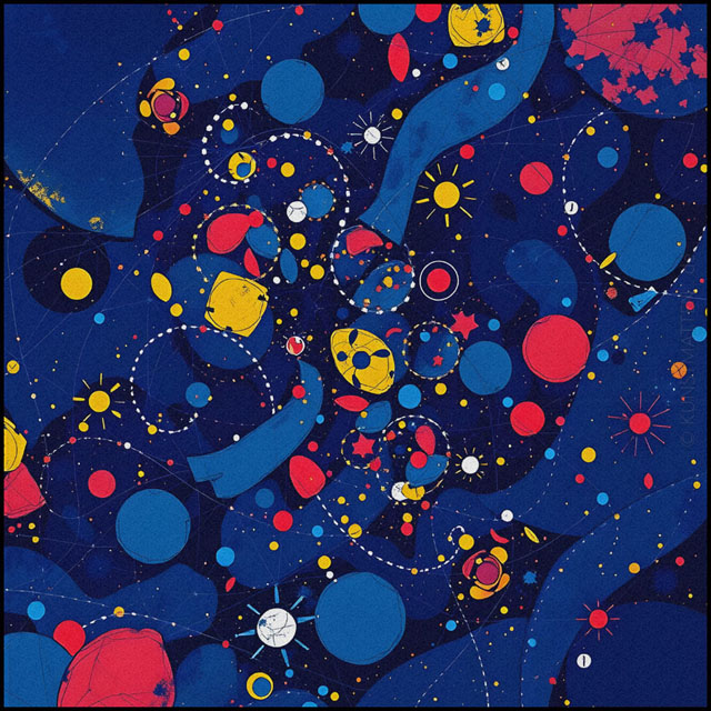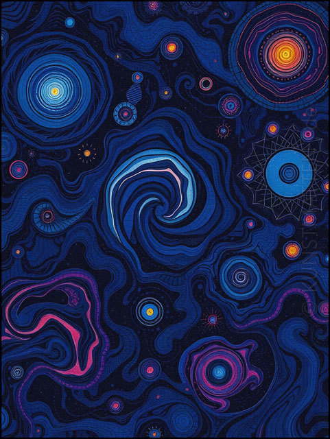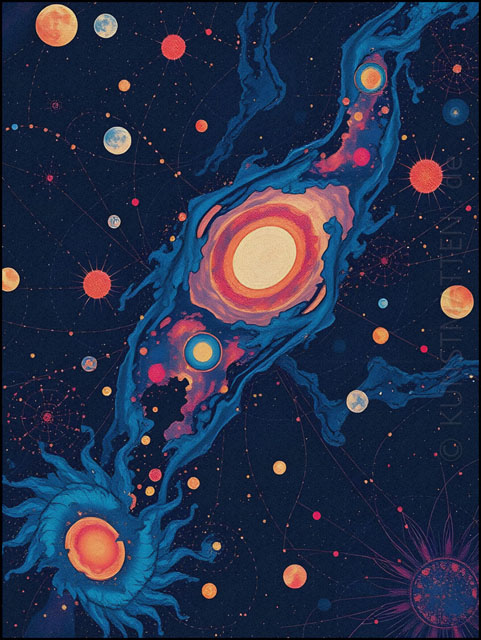 Abstrakte Darstellungen des Universums als faszinierende Basismuster. Ergänzt durch Popart-Grafiken der „Frucht-Planeten“ – verspielt, bunt und kosmisch kreativ.